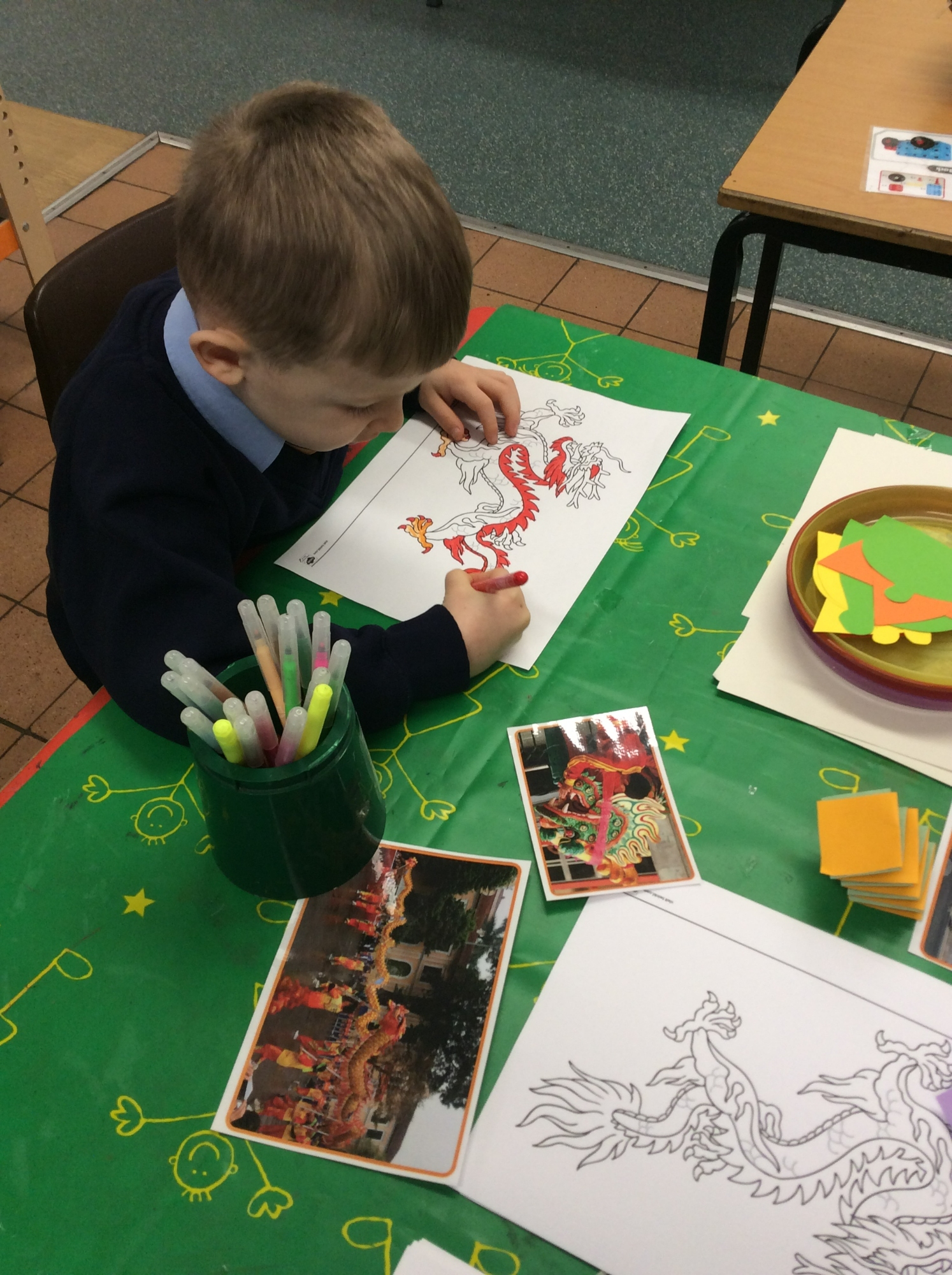 The children have been learning about Chinese new year in Class 1 and they have had a go at various activities linked to this. They have made playdough noodles, a dragon in construction, paper lanterns, dancing dragons and they have even tried out some writing. Wow!