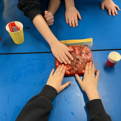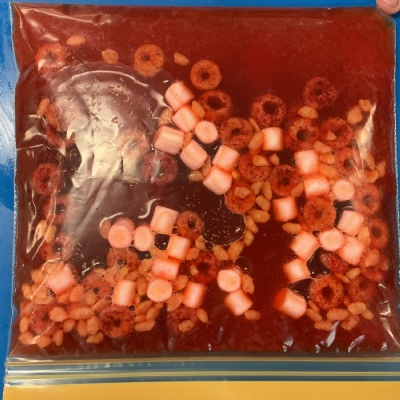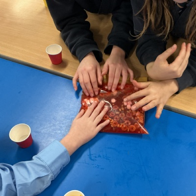 This week in Science, we looked at the role of blood in our body. We learnt that the red blood cells carry oxygen around our body, the white blood cells fight infection, platelets help heal our wounds, and the plasma helps transport all of those cells, plus nutrients, around our body. To help with our understanding, we made our own blood using water, food colouring, cereal and marshmallows to represent the different parts of blood. See if your child can tell you which is which!