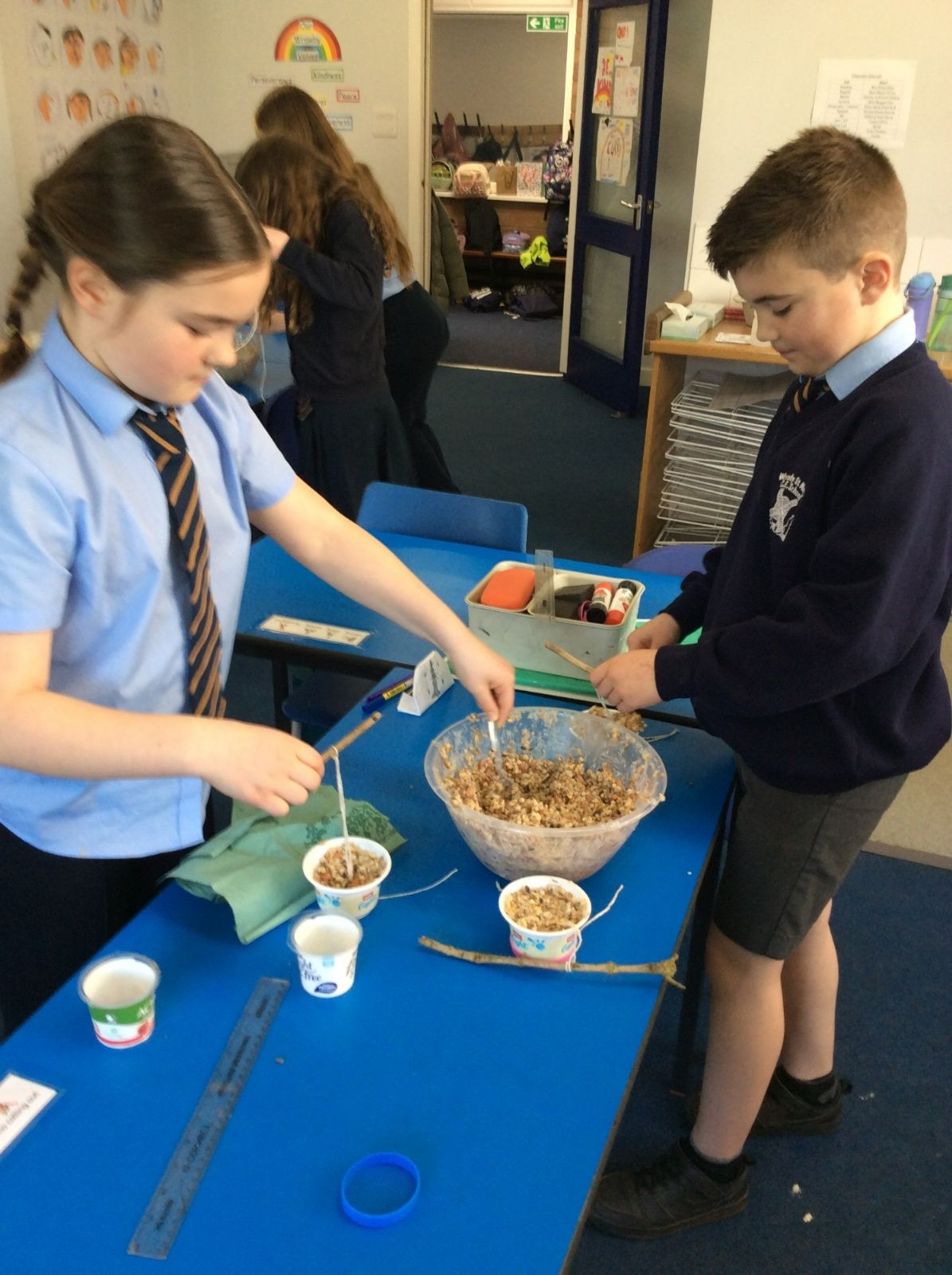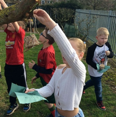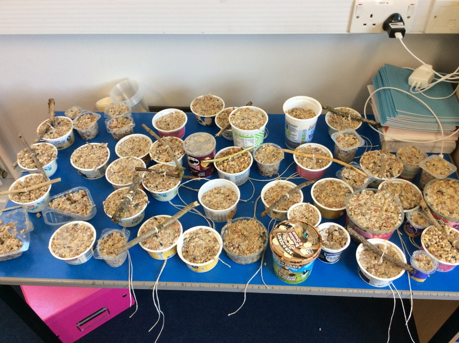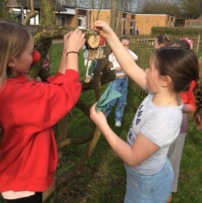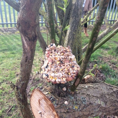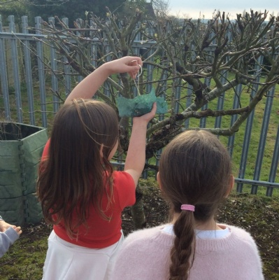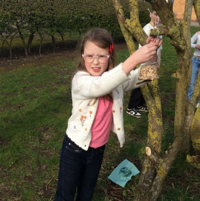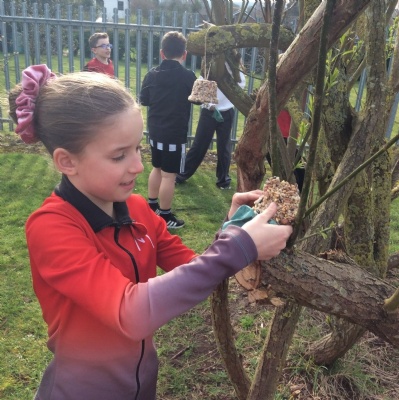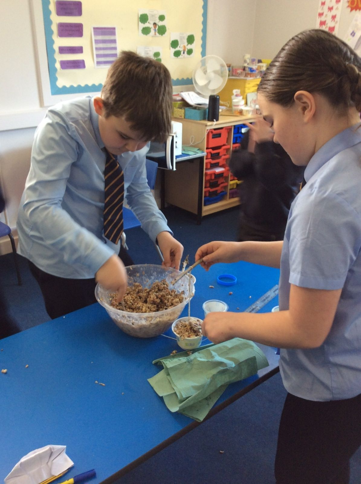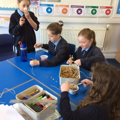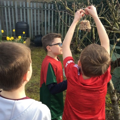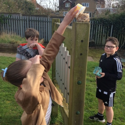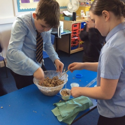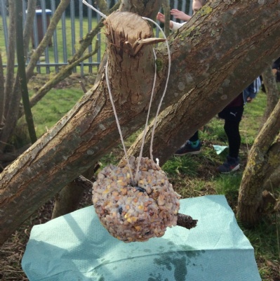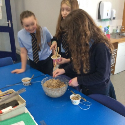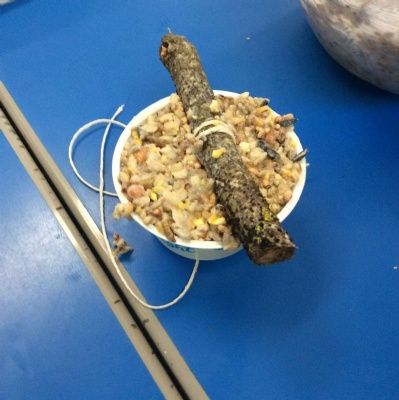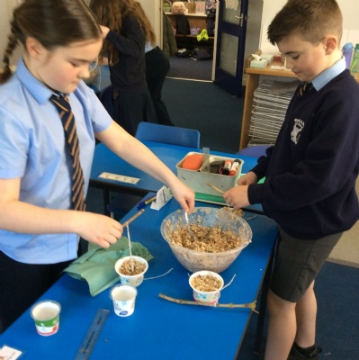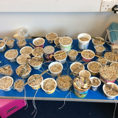 This week is Science related again! We have been thinking about how we can help the birds in our local area. Using bird seed, peanuts, mealworms and lard, we have created a healthy concoction for our local birds to eat. We also used some DT skills, collecting sticks, tying string to them, making a hole in the pot and threading it through. Once set, the pots will – hopefully – be removed. The string is for hanging them in the wildlife area and the stick is to allow the birds to sit on while eating. We had so much food left, we made some without sticks too! These could sit on a bird table or a wall instead.