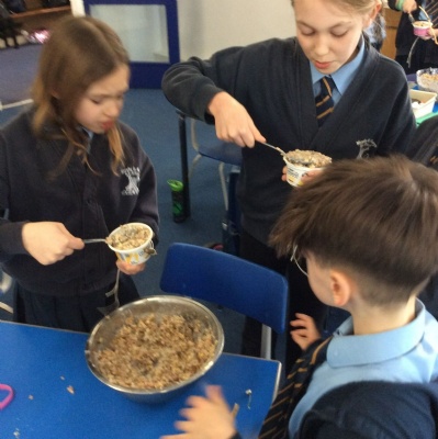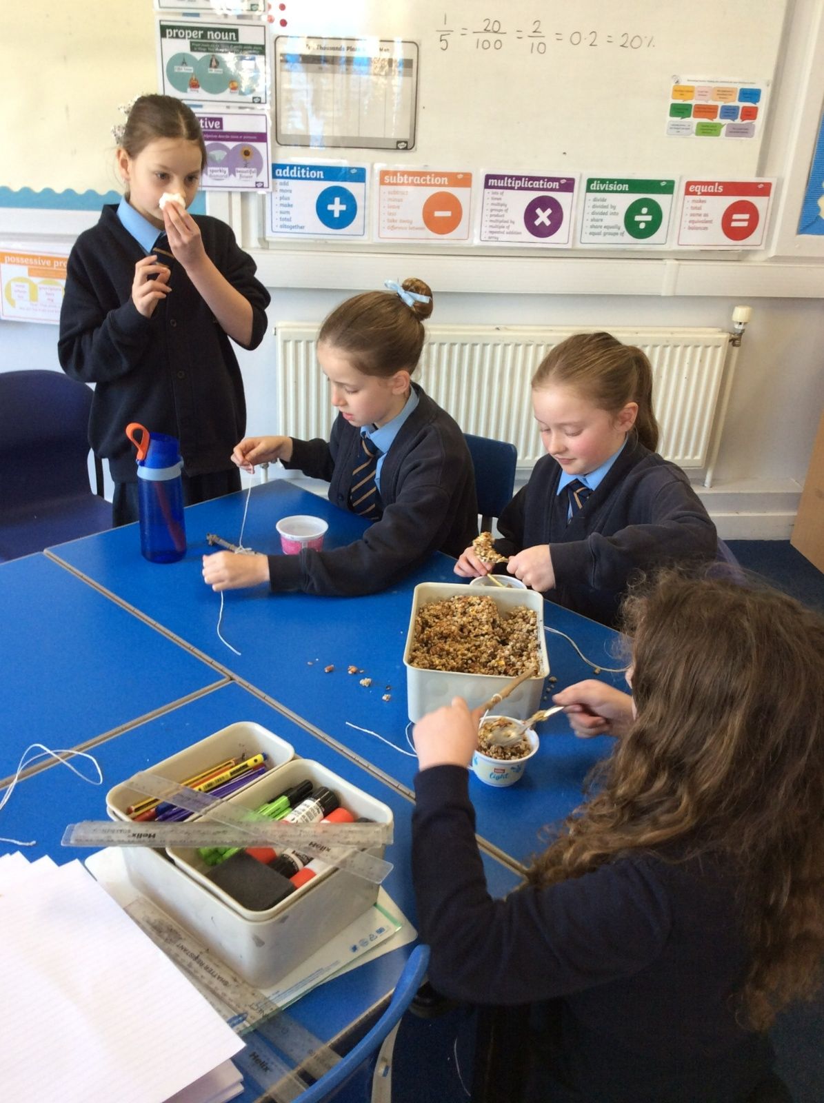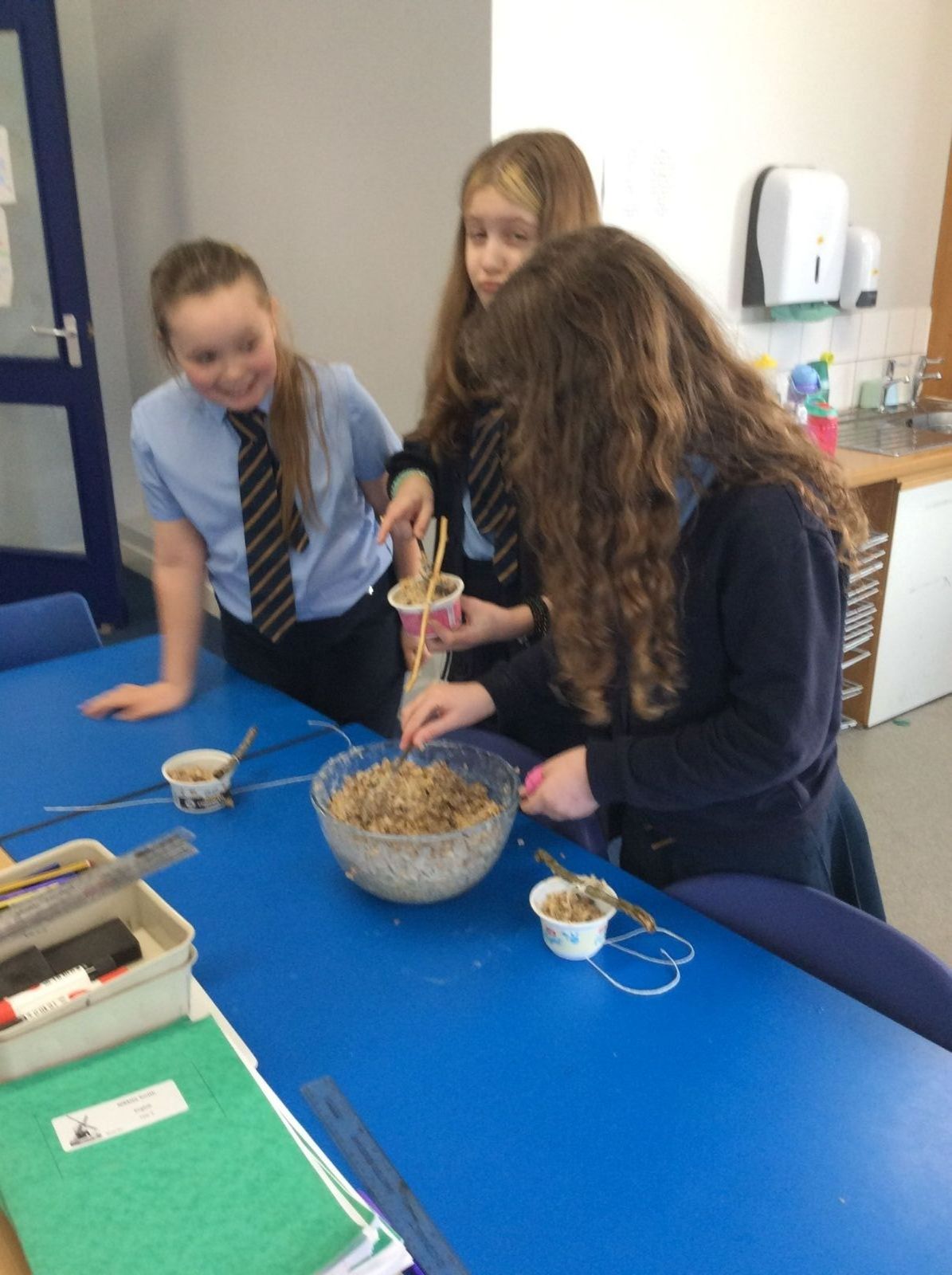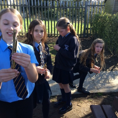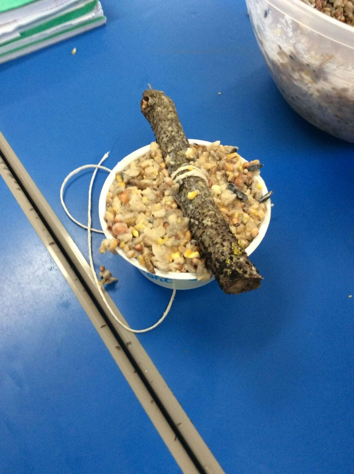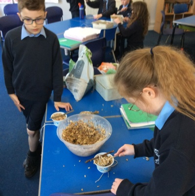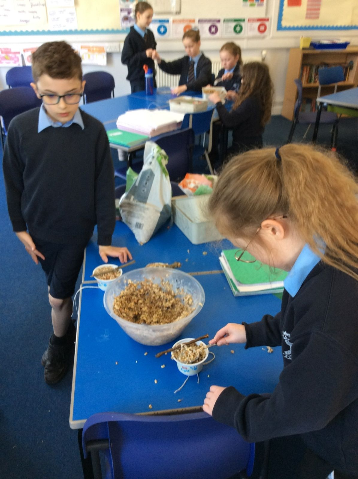 This week is Science related again! We have been thinking about how we can help the birds in our local area. Using bird seed, peanuts, mealworms and lard, we have created a healthy concoction for our local birds to eat. We also used some DT skills, collecting sticks, tying string to them, making a hole in the pot and threading it through. Once set, the pots will – hopefully – be removed. The string is for hanging them in the wildlife area and the stick is to allow the birds to sit on while eating. We had so much food left, we made some without sticks too! These could sit on a bird table or a wall instead.